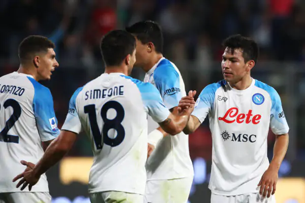CREMONA, ITALY - OCTOBER 09: Hirving Lozano of Napoli celebrates with teammates after scoring their team's third goal during the Serie A match between US Cremonese and SSC Napoli at Stadio Giovanni Zini on October 09, 2022 in Cremona, Italy. (Photo by Marco Luzzani/Getty Images)