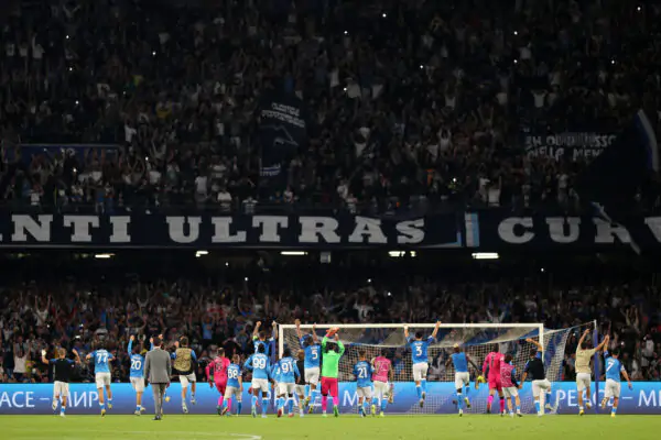 NAPLES, ITALY - OCTOBER 12: SSC Napoli players celebrate the victory after the UEFA Champions League group A match between SSC Napoli and AFC Ajax at Stadio Diego Armando Maradona on October 12, 2022 in Naples, Italy. (Photo by Francesco Pecoraro/Getty Images)