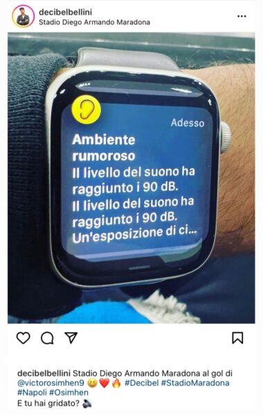A postare questo curioso retroscena è lo speaker del Maradona, Daniele Decibel Bellini, tramite un post su Instagram. Lo smartwatch di Bellini subito dopo il gol citava così: “Ambiente Rumoroso. Il livello del suono ha raggiunto i 90 dB.”