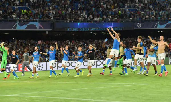 NAPLES, ITALY - SEPTEMBER 07: Players of SSC Napoli celebrate the victory after the UEFA Champions League group A match between SSC Napoli and Liverpool FC at Stadio Diego Armando Maradona on September 7, 2022 in Naples, Italy. (Photo by Giuseppe Bellini/Getty Images)