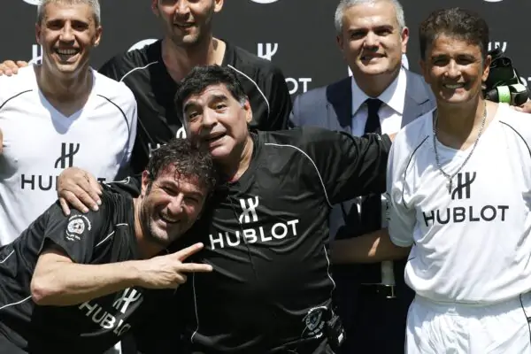 Former football players Argentinian Diego Maradona (C) Italian Ciro Ferrara (L), Brazilian Bebeto (R) and Hublot CEO Ricardo Guadalupe (2ndR) pose after a friendly football match organised by Swiss luxury watchmaker Hublot at the Jardin du Royal in Paris on June 9, 2016, on the eve of the Euro 2016 European football championships. / AFP / PATRICK KOVARIK (Photo credit should read PATRICK KOVARIK/AFP via Getty Images)