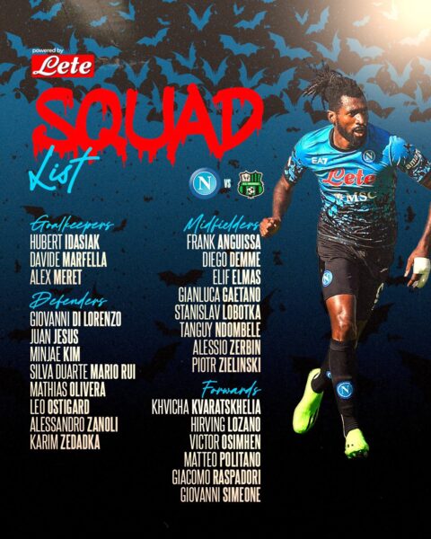 Di seguito la squadra completa dei convocati della squadra azzurra per la sfida di oggi pomeriggio del Diego Armando Maradona contro il Sassuolo: