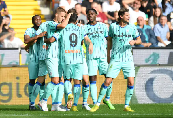 UDINE, ITALY - OCTOBER 09: Ademola Lookman of Atalanta BC celebrates scoring their side's first goal with teammates during the Serie A match between Udinese Calcio and Atalanta BC at Dacia Arena on October 09, 2022 in Udine, Italy. (Photo by Alessandro Sabattini/Getty Images)
