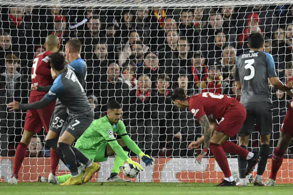 Napoli's Italian goalkeeper Alex Meret spills a header from Liverpool's Uruguayan striker Darwin Nunez (2R) before Liverpool's Egyptian striker Mohamed Salah (not seen) scores his team's first goal during the UEFA Champions League group A football match between Liverpool and Napoli in Liverpool, north west England on November 1, 2022. (Photo by Oli SCARFF / AFP) (Photo by OLI SCARFF/AFP via Getty Images)