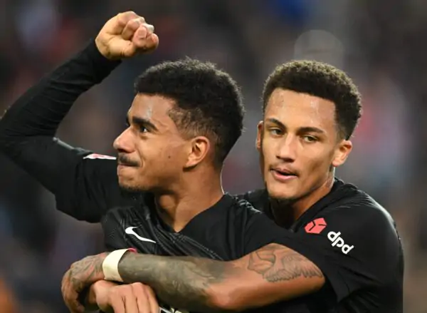 Frankfurt's German forward Ansgar Knauff (L) celebrates after scoring his team's second goal (1-2) with Frankfurt's Brazilian defender Tuta during the German first division Bundesliga football match between FC Augsburg and Eintracht Frankfurt in Augsburg, southern Germany on November 5, 2022. - DFL REGULATIONS PROHIBIT ANY USE OF PHOTOGRAPHS AS IMAGE SEQUENCES AND/OR QUASI-VIDEO (Photo by Christof STACHE / AFP) / DFL REGULATIONS PROHIBIT ANY USE OF PHOTOGRAPHS AS IMAGE SEQUENCES AND/OR QUASI-VIDEO (Photo by CHRISTOF STACHE/AFP via Getty Images)