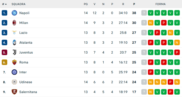 Il Napoli continua a primeggiare, con il Milan ora a ben 8 lunghezze dalla squadra di Luciano Spalletti. Gli azzurri sono a quota 38 punti, mentre gli uomini di Pioli si posizionano al secondo posto a 30.