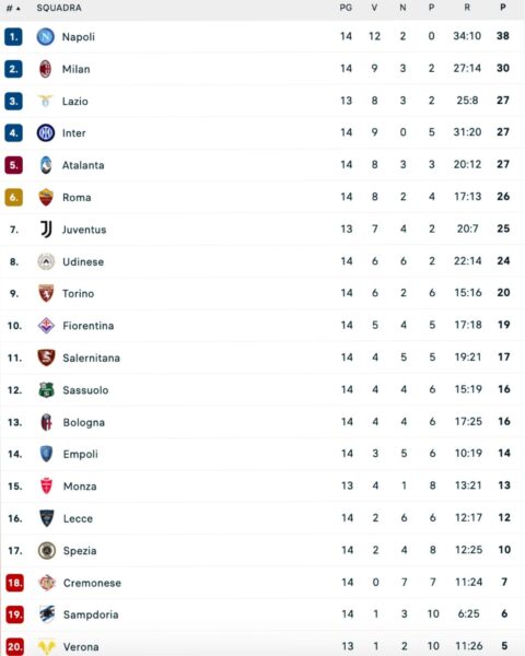 In testa alla classifica c’è sempre il Napoli di Luciano Spalletti, con un vantaggio di otto punti sul Milan secondo e undici punti sul gruppetto di inseguitrici formato da Inter, Lazio (con una partita in meno) e Atalanta, rincorrono il trio di inseguitrici Roma, Juventus e Udinese.