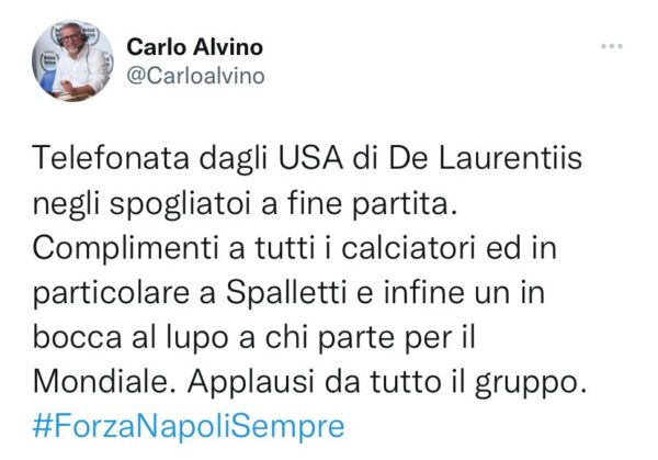 “Telefonata dagli USA di De Laurentiis negli spogliatoi a fine partita“, ha scritto Alvino. “Complimenti a tutti i calciatori ed in particolare a Spalletti e infine un in bocca al lupo a chi parte per il Mondiale. Applausi da tutto il gruppo”.