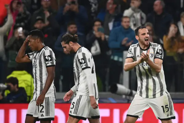 Juventus' players and Juventus' Italian defender Federico Gatti (R) celebrate after scoring a goal during the UEFA Champions League 1st round day 6 group H football match between Juventus Turin and Paris Saint-Germain (PSG) at the Juventus stadium in Turin on November 2, 2022. (Photo by FRANCK FIFE / AFP) (Photo by FRANCK FIFE/AFP via Getty Images)