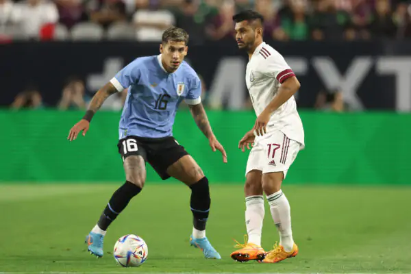 GLENDALE, ARIZONA - JUNE 02: Jesús Corona #17 of Team Mexico and Mathías Olivera #16 of Team Uruguay in action during an international friendly match at State Farm Stadium on June 02, 2022 in Glendale, Arizona. Uruguay defeated Mexico 3-0. (Photo by Christian Petersen/Getty Images)