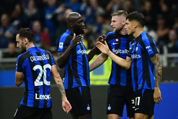 Inter Milan's Argentinian forward Joaquin Correa (R) is congratulated by Inter Milan's Belgian forward Romelu Lukaku, Inter Milan's Slovakian defender Milan Skriniar and Inter Milan's Turkish midfielder Hakan Calhanoglu after scoring his third team goal during the Italian Serie A football match between Inter Milan and Sampdoria at the Giuseppe-Meazza (San Siro) stadium in Milan on October 29, 2022. (Photo by MIGUEL MEDINA / AFP) (Photo by MIGUEL MEDINA/AFP via Getty Images)