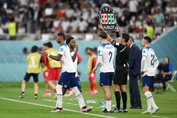 DOHA, QATAR - NOVEMBER 21: Marcus Rashford replaces Raheem Sterling of England during the FIFA World Cup Qatar 2022 Group B match between England and IR Iran at Khalifa International Stadium on November 21, 2022 in Doha, Qatar. (Photo by Matthias Hangst/Getty Images)