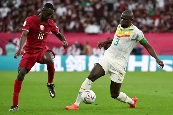 Qatar's forward #19 Almoez Ali (L) and Senegal's defender #03 Kalidou Koulibaly fight for the ball during the Qatar 2022 World Cup Group A football match between Qatar and Senegal at the Al-Thumama Stadium in Doha on November 25, 2022. (Photo by OZAN KOSE / AFP) (Photo by OZAN KOSE/AFP via Getty Images)