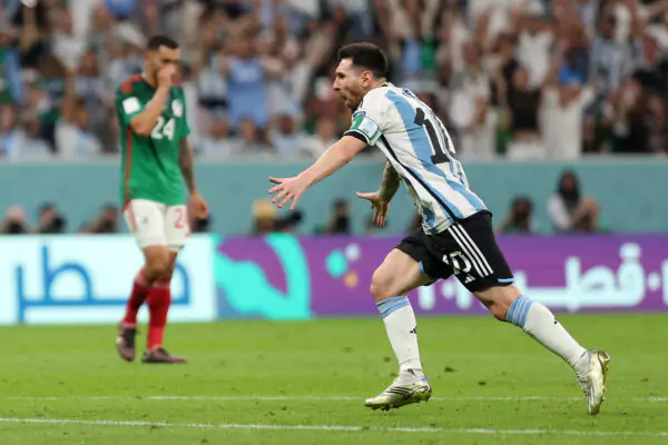 LUSAIL CITY, QATAR - NOVEMBER 26: Lionel Messi of Argentina celebrates scoring their team's first goal during the FIFA World Cup Qatar 2022 Group C match between Argentina and Mexico at Lusail Stadium on November 26, 2022 in Lusail City, Qatar. (Photo by Dean Mouhtaropoulos/Getty Images)