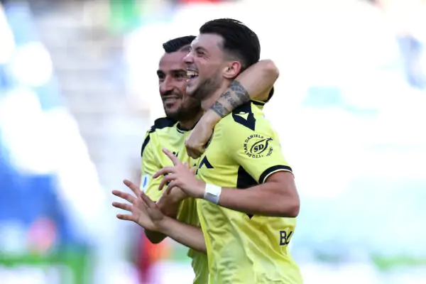 REGGIO NELL'EMILIA, ITALY - SEPTEMBER 11: Lazar Samardzic of Udinese Calcio celebrates with teammate Ilija Nestorovski after scoring their team's second goal during the Serie A match between US Sassuolo and Udinese Calcio at Mapei Stadium - Citta' del Tricolore on September 11, 2022 in Reggio nell'Emilia, Italy. (Photo by Alessandro Sabattini/Getty Images)