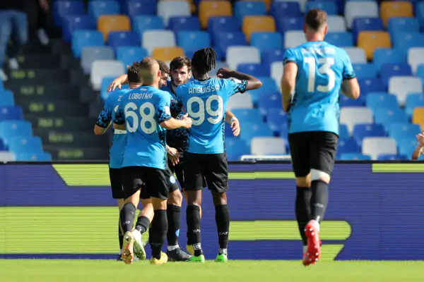 NAPLES, ITALY - OCTOBER 01: Khvicha Kvaratskhelia of SSC Napoli celebrates with teammates after scoring the third goal for his team during the Serie A match between SSC Napoli and Torino FC at Stadio Diego Armando Maradona on October 01, 2022 in Naples, Italy. (Photo by Francesco Pecoraro/Getty Images)
