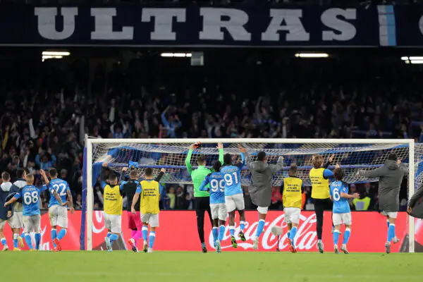 NAPLES, ITALY - NOVEMBER 12: SSC Napoli players celebrate the victory after the Serie A match between SSC Napoli and Udinese Calcio at Stadio Diego Armando Maradona on November 12, 2022 in Naples, Italy. (Photo by Francesco Pecoraro/Getty Images)