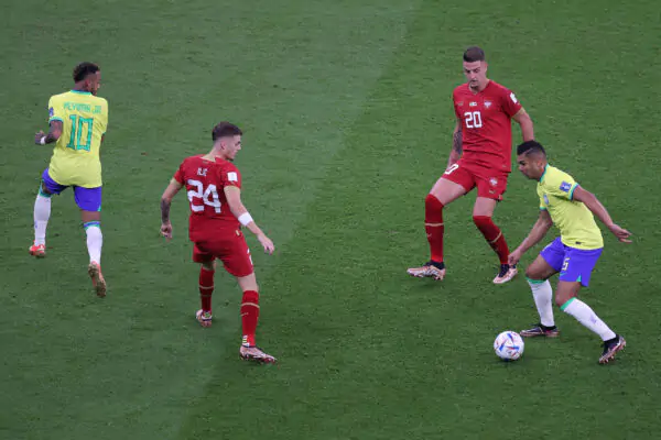 LUSAIL CITY, QATAR - NOVEMBER 24: Casemiro of Brazil is shadowed by Sergej Milinkovic-Savic and Ivan Ilic of Serbia during the FIFA World Cup Qatar 2022 Group G match between Brazil and Serbia at Lusail Stadium on November 24, 2022 in Lusail City, Qatar. (Photo by Michael Steele/Getty Images)
