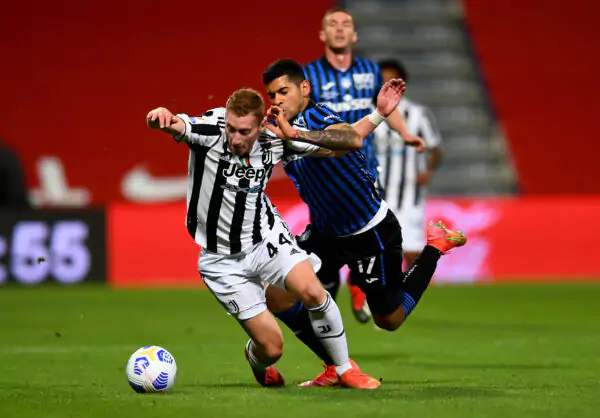 REGGIO NELL'EMILIA, ITALY - MAY 19: Dejan Kulusevski of Juventus is tackled by Cristian Romero of Atalanta B.C. during the TIMVISION Cup Final between Atalanta BC and Juventus on May 19, 2021 in Reggio nell'Emilia, Italy. A limited number of fans will be allowed into the stadium as Coronavirus restrictions begin to ease in the UK. (Photo by Claudio Villa/Getty Images for Lega Serie A)