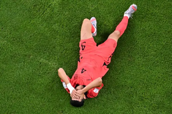 South Korea's defender #04 Kim Min-jae reacts during the Qatar 2022 World Cup Group H football match between Uruguay and South Korea at the Education City Stadium in Al-Rayyan, west of Doha on November 24, 2022. (Photo by François-Xavier MARIT / AFP) (Photo by FRANCOIS-XAVIER MARIT/AFP via Getty Images)