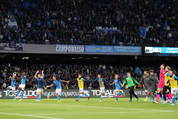 NAPLES, ITALY - NOVEMBER 12: SSC Napoli players celebrate the victory after the Serie A match between SSC Napoli and Udinese Calcio at Stadio Diego Armando Maradona on November 12, 2022 in Naples, Italy. (Photo by Francesco Pecoraro/Getty Images)
