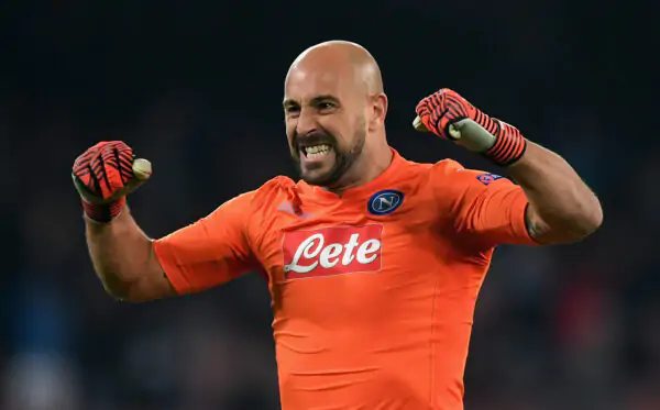 NAPLES, ITALY - NOVEMBER 01: Jose Reina of SSC Napoli celebrates his sides first goal during the UEFA Champions League group F match between SSC Napoli and Manchester City at Stadio San Paolo on November 1, 2017 in Naples, Italy. (Photo by Shaun Botterill/Getty Images)