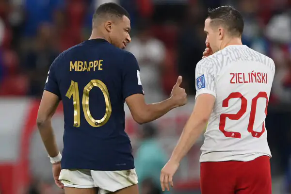 France's forward #10 Kylian Mbappe (L)talks with Poland's midfielder #20 Piotr Zielinski as he celebrates after his team won the Qatar 2022 World Cup round of 16 football match between France and Poland at the Al-Thumama Stadium in Doha on December 4, 2022. (Photo by FRANCK FIFE / AFP) (Photo by FRANCK FIFE/AFP via Getty Images)