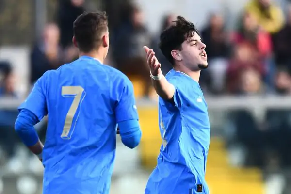 SASSUOLO, ITALY - NOVEMBER 21: Giuseppe Ambrosino of Italy U20 celebrates after scoring the opening goal during the 8 Nations Tournament match between Italy U20 and Czech Republic U20 at Enzo Ricci Stadium on November 21, 2022 in Sassuolo, Italy. (Photo by Alessandro Sabattini/Getty Images)