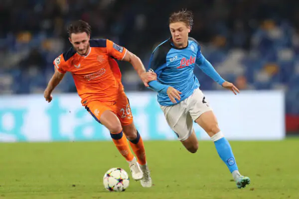 NAPLES, ITALY - OCTOBER 26: Ben Davies of Rangers is challenged by Alessio Zerbin of Napoli during the UEFA Champions League group A match between SSC Napoli and Rangers FC at Stadio Diego Armando Maradona on October 26, 2022 in Naples, Italy. (Photo by Francesco Pecoraro/Getty Images)