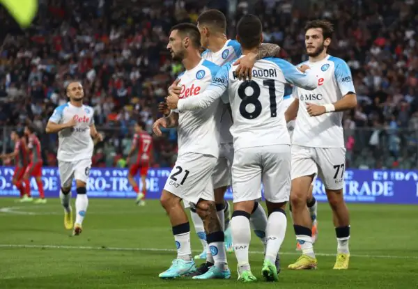CREMONA, ITALY - OCTOBER 09: Matteo Politano #21 of SSC Napoli celebrates with his team-mates from the penalty spot after scoring the opening goal during the Serie A match between US Cremonese and SSC Napoli at Stadio Giovanni Zini on October 09, 2022 in Cremona, Italy. (Photo by Marco Luzzani/Getty Images)