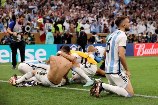 LUSAIL CITY, QATAR - DECEMBER 18: Argentina players celebrate after the team's victory in the penalty shoot out during the FIFA World Cup Qatar 2022 Final match between Argentina and France at Lusail Stadium on December 18, 2022 in Lusail City, Qatar. (Photo by Clive Brunskill/Getty Images)