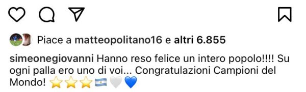 L’attaccante del Napoli, Giovanni Simeone, festeggia la vittoria dell’Argentina ai Mondiali, nonostante la delusione di essere stato escluso dal CT Scaloni.