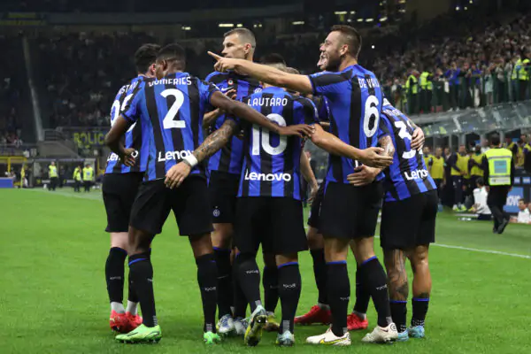 MILAN, ITALY - OCTOBER 29: Stefan de Vrij of FC Internazionale celebrates with teammates after scoring their team's first goal during the Serie A match between FC Internazionale and UC Sampdoria at Stadio Giuseppe Meazza on October 29, 2022 in Milan, Italy. (Photo by Marco Luzzani/Getty Images)