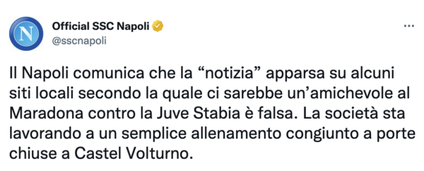 AGGIORNAMENTO ORE 10:23 – In questa mattinata era stata diffusa la notizia di un’ultima amichevole al Maradona prima della chiusura dell’anno. Il Napoli ha da qualche minuto smentito la notizia comunicando attraverso il suo profilo Twitter che si sta lavorando ad un semplice allenamento congiunto a Castel Volturno tra le due squadre campane.