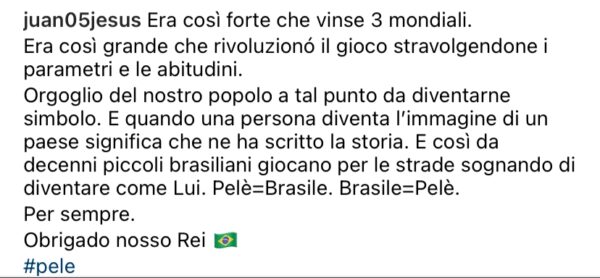 Tra questi, non poteva mancare il difensore brasiliano del Napoli Juan Jesus, che ha affidato ai social il saluto al suo idolo.