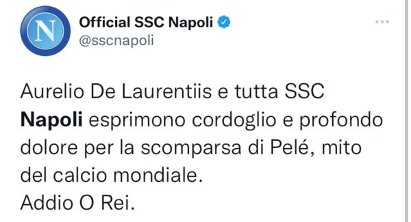 “Aurelio De Laurentiis e tutta SSC Napoli esprimono cordoglio e profondo dolore per la scomparsa di Pelé, mito del calcio mondiale.