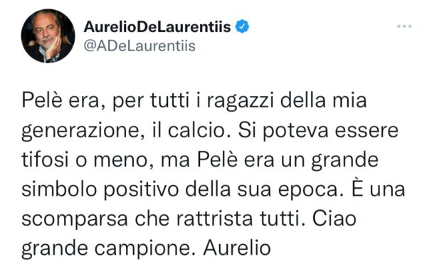 “Pelè era, per tutti i ragazzi della mia generazione, il calcio. Si poteva essere tifosi o meno, ma Pelè era un grande simbolo positivo della sua epoca. È una scomparsa che rattrista tutti. Ciao grande campione. Aurelio“.