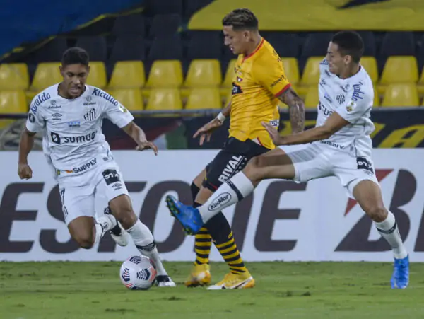 Ecuador's Barcelona Carlos Garces (C) vies for the ball with Brazil's Santos Angelo Gabriel (L) and teammate Kaiky Melo during their Copa Libertadores football tournament group stage match at the Monumental Stadium in Guayaquil, Ecuador, on May 26, 2021. (Photo by Marcos Pin / POOL / AFP) (Photo by MARCOS PIN/POOL/AFP via Getty Images)