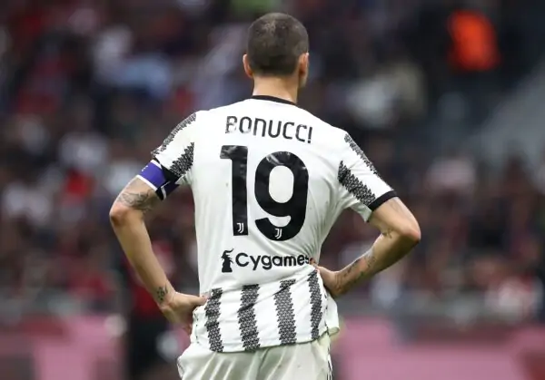 MILAN, ITALY - OCTOBER 08: The back of Leonardo Bonucci of Juventus FC is shown during the Serie A match between AC Milan and Juventus at Stadio Giuseppe Meazza on October 08, 2022 in Milan, Italy. (Photo by Marco Luzzani/Getty Images)