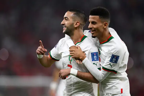 DOHA, QATAR - DECEMBER 01: Hakim Ziyech (L) of Morocco celebrates with Azzedine Ounahi after scoring the team's first goal during the FIFA World Cup Qatar 2022 Group F match between Canada and Morocco at Al Thumama Stadium on December 01, 2022 in Doha, Qatar. (Photo by Matthias Hangst/Getty Images)