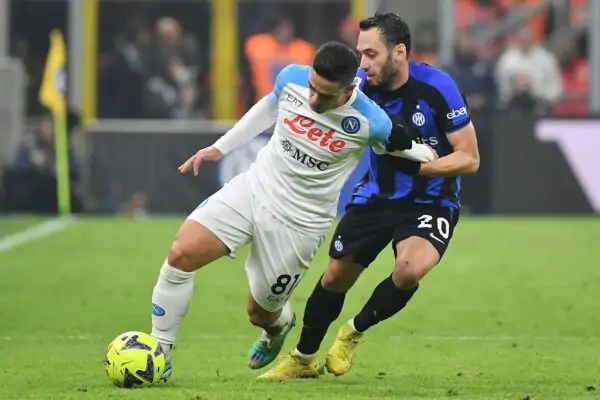 Napoli's Italian forward Giacomo Raspadori (L) fights for the ball with Inter Milan's Turkish midfielder Hakan Calhanoglu during the Italian Serie A football match between Inter Milan and Napoli at Giuseppe Meazza stadium in Milan, on January 4, 2023 (Photo by Isabella BONOTTO / AFP) (Photo by ISABELLA BONOTTO/AFP via Getty Images)