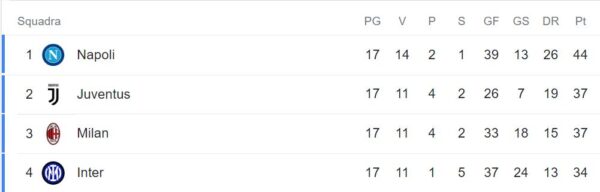Gioia invece in casa Napoli: con 7 punti di vantaggio su Milan e Juventus a due giornate dal termine del girone d’andata, gli azzurri diventano infatti campioni d’inverno. La speranza è che vada meglio rispetto alle ultime due volte in cui gli azzurri hanno raggiunto tale obiettivo con Sarri in panchina, dove gli azzurri non riuscirono ad ottenere il Tricolore.