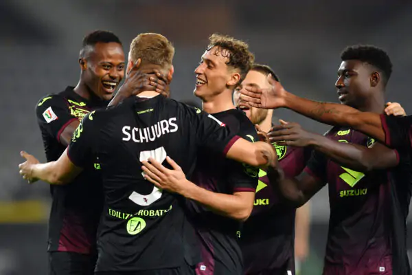 TURIN, ITALY - OCTOBER 18: Perr Schuurs of Torino FC celebrates with teammates after scoring their team's third goal during the Coppa Italia match between Torino FC and Cittadella at Olimpico Stadium on October 18, 2022 in Turin, Italy. (Photo by Valerio Pennicino/Getty Images)