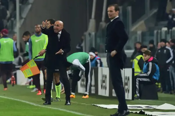 Roma's coach Luciano Spalletti (L) reacts next to Juventus' coach from Italy Massimiliano Allegri during the Italian Serie A match Juventus vs AS Roma at "Juventus Stadium" in Turin on January 24, 2016. AFP PHOTO / GIUSEPPE CACACE / AFP / GIUSEPPE CACACE (Photo credit should read GIUSEPPE CACACE/AFP via Getty Images)