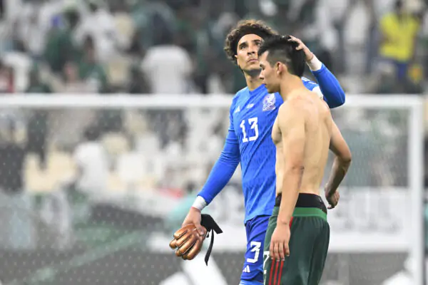 TOPSHOT - Mexico's goalkeeper #13 Guillermo Ochoa (2nd R) reacts at the end of the Qatar 2022 World Cup Group C football match between Saudi Arabia and Mexico at the Lusail Stadium in Lusail, north of Doha on November 30, 2022. (Photo by Alfredo ESTRELLA / AFP) (Photo by ALFREDO ESTRELLA/AFP via Getty Images)