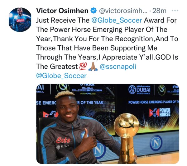 Di seguito il messaggio di Osimhen dopo aver ricevuto il premio ed aver twittato uno scatto in compagnia del trofeo.