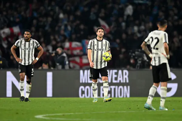 NAPLES, ITALY - JANUARY 13: Bremer and Manuel Locatelli of Juventus show their disappointment during the Serie A match between SSC Napoli and Juventus at Stadio Diego Armando Maradona on January 13, 2023 in Naples, Italy. (Photo by Francesco Pecoraro/Getty Images)