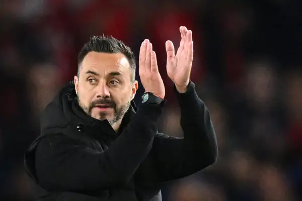 Brighton's Italian head coach Roberto De Zerbi applauds at the end of the English Premier League football match between Brighton and Hove Albion and Nottingham Forest at the American Express Community Stadium in Brighton, southern England on October 18, 2022. - Brighton and Hove Albion and Nottingham Forest equalized 0 - 0. - RESTRICTED TO EDITORIAL USE. No use with unauthorized audio, video, data, fixture lists, club/league logos or 'live' services. Online in-match use limited to 120 images. An additional 40 images may be used in extra time. No video emulation. Social media in-match use limited to 120 images. An additional 40 images may be used in extra time. No use in betting publications, games or single club/league/player publications. (Photo by Glyn KIRK / AFP) / RESTRICTED TO EDITORIAL USE. No use with unauthorized audio, video, data, fixture lists, club/league logos or 'live' services. Online in-match use limited to 120 images. An additional 40 images may be used in extra time. No video emulation. Social media in-match use limited to 120 images. An additional 40 images may be used in extra time. No use in betting publications, games or single club/league/player publications. / RESTRICTED TO EDITORIAL USE. No use with unauthorized audio, video, data, fixture lists, club/league logos or 'live' services. Online in-match use limited to 120 images. An additional 40 images may be used in extra time. No video emulation. Social media in-match use limited to 120 images. An additional 40 images may be used in extra time. No use in betting publications, games or single club/league/player publications. (Photo by GLYN KIRK/AFP via Getty Images)