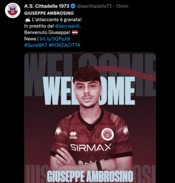 AGGIORNAMENTO 18/01 ore 18:00 – Adesso è ufficiale, Ambrosino va al Cittadella in prestito per sei mesi. Arriva, dopo l’anticipazione di ieri, il comunicato ufficiale del passaggio del calciatore di proprietà del Napoli alla squadra di Serie B.