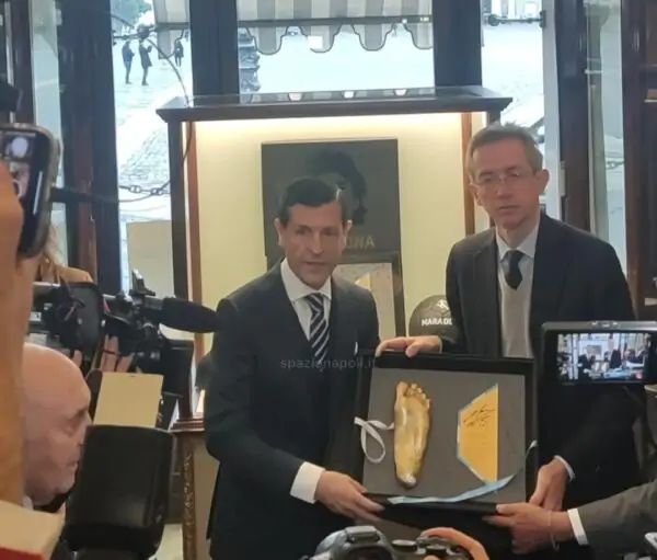 Questa mattina al Bar Gambrinus di Via Chiaia, è stato donato il calco del piede sinistro di Diego Armando Maradona. Stefano Ceci, ex procuratore del Pibe de Oro, ha deciso di regalare un cimelio importantissimo ad uno dei bar storici della città.
